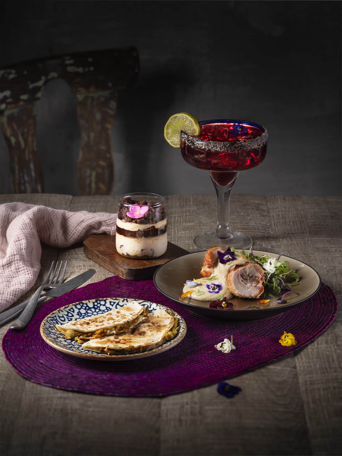 La oferta de la taquería mexicana incluye: “Quesadilla de flor de calabaza”, dos tortillas de trigo rellenas de flor de calabaza con queso gouda fundido y acompañado de guacamole y pico de gallo; y “Pollo mole blanco”, un jugoso contramuslo de pollo acompañado de mole blanco, frutos secos tostados y chocolate blanco. El punto dulce se lo da el postre, una mini “Copa Cajeta”, compuesta por varias capas de bizcocho, nata y dulce de leche. Todo esto acompañado de un “Margarita Jamaica”, al que le añaden Tajín y una infusión de flor de Jamaica. El PVP del menú es de 18,50€.